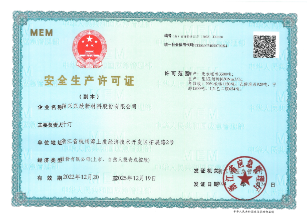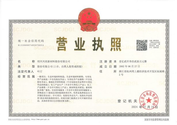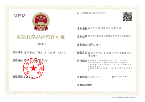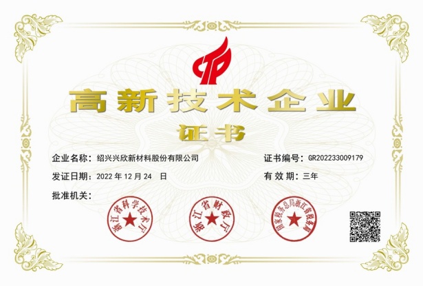 紹興興欣新材料股份有限公司成立于2002年06月27日,占地面積122畝,位于杭州灣上虞經(jīng)濟(jì)技術(shù)開發(fā)區(qū)拓展路2號,現(xiàn)有職工200余人,專業(yè)技術(shù)人員50余人;博士、碩士研究生30余人組成的一支知識型、專業(yè)化的技術(shù)科研團(tuán)隊(duì)。公司面向全球市場,專業(yè)開發(fā)電子化學(xué)品、環(huán)?;瘜W(xué)品、醫(yī)藥中間體、高分子材料等先進(jìn)新材料重點(diǎn)領(lǐng)域的省級科技型企業(yè);建有浙江上虞、安徽東至兩個生產(chǎn)基地。目前為“國家高新技術(shù)企業(yè)”、浙江省“隱形冠軍”企業(yè)、浙江省專精特新中小企業(yè);建有“省級”研究開發(fā)中心,共建天津大學(xué)浙江紹興研究院電子化學(xué)品研發(fā)中心。